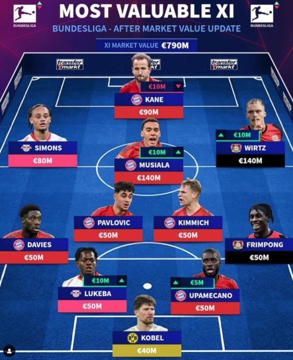 12月20日訊 《轉(zhuǎn)會(huì)市場》今日更新了德甲球員身價(jià),并列出了一套德甲最貴陣,拜仁6將在列,萊比錫、藥廠各2人。
